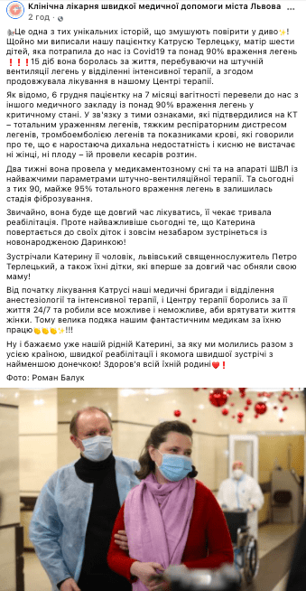 “Це одна з тих унікальних історій, що змушують повірити у диво! Щойно ми виписали нашу пацієнтку Катрусю Терлецьку, матір шести дітей, яка потрапила до нас із Covid19 та понад 90% враження легень 15 діб вона боролась за життя, перебуваючи на штучній вентиляції легень у відділенні інтенсивної терапії, а згодом продовжувала лікування в нашому Центрі терапії.