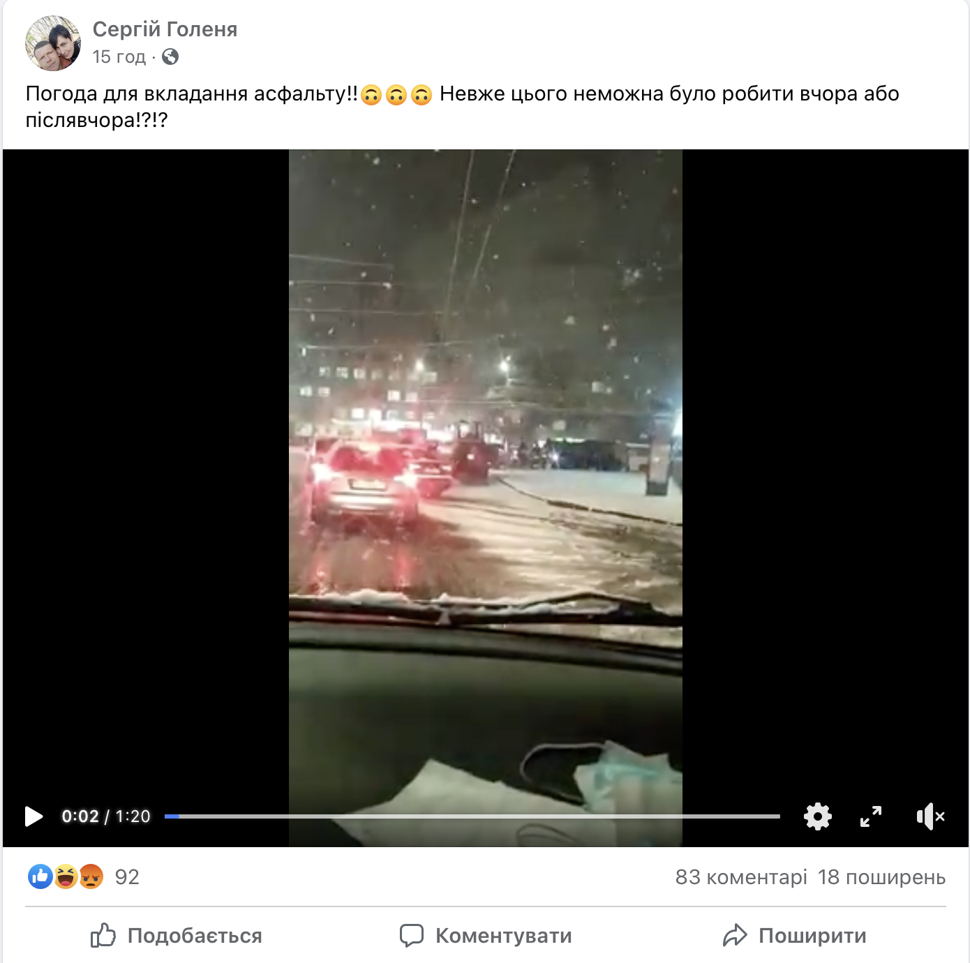 Луцький міський голова Ігор Поліщук на оперативній нараді розказав, що вчора один із підрядників при настанні несприятливих погодних умов продовжував здійснювати вкладання асфальту.