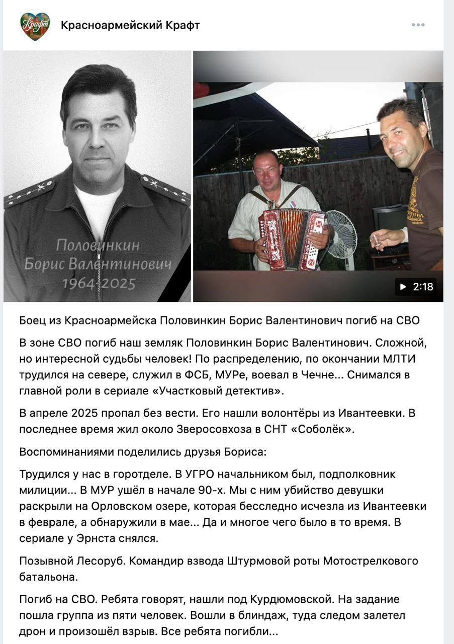До слова, Половінкін розпочав кар’єру в 1990-х як міліціонер, служив у Чечні, де отримав звання підполковника. Після завершення служби він вирішив спробувати себе в акторстві — знімався у детективних серіалах, де часто грав «правоохоронців» і «героїв». Утім, коли Росія розв’язала повномасштабну війну проти України, актор став частиною армії окупантів, але ЗСУ дещо змінили сценарій цього «детективу».